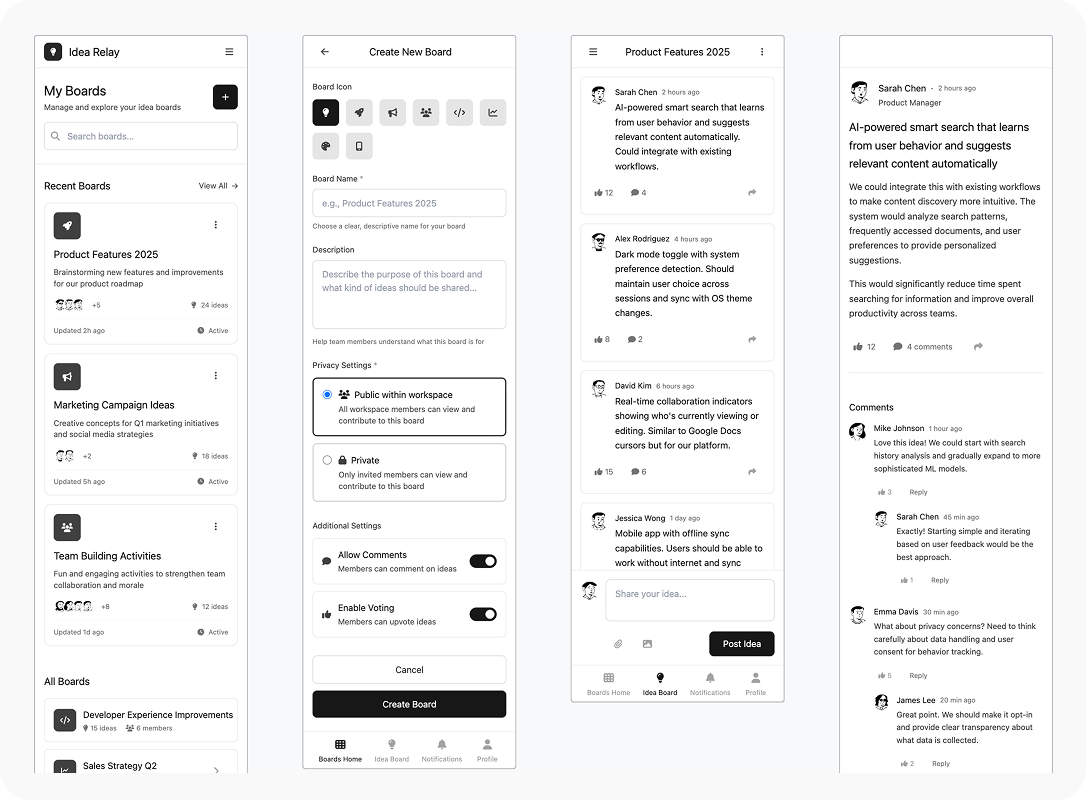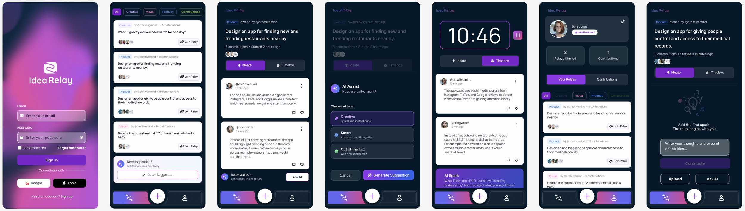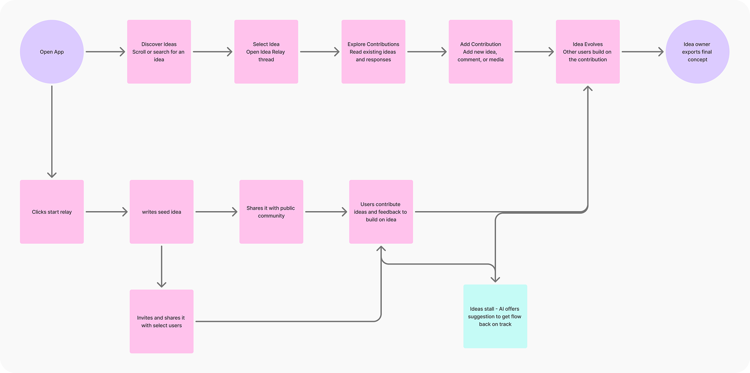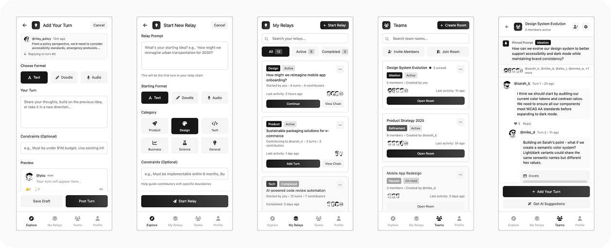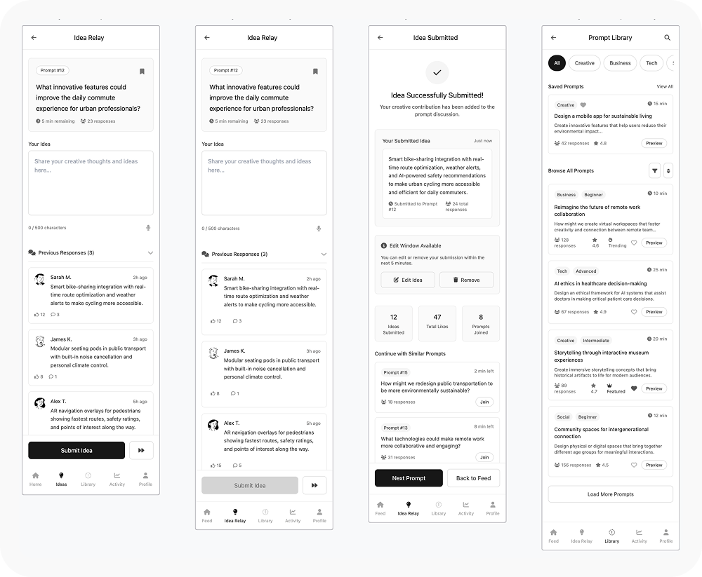 Idea Relay explores how a digital platform could support continuous, low-pressure idea sharing, allowing teams to contribute ideas over time and build on each other’s thinking.